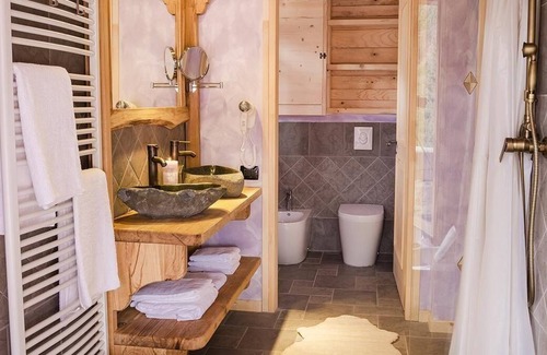 Vacation chalet overlooking the DolomitesA holiday village where wood is the protagonist: the perfect place for your stay in the mountains of Friuli Venezia Giulia. Surrounded by forests, the Village Dolomites is located in a secluded and relaxed setting: a haven in nature, away from everyday life.The chalet, made entirely of wood, is on two floors plus a mezzanine and can accommodate two to seven people. The sleeping area, upstairs, consists of a double bedroom, a relaxation area that becomes a bedroom with four beds, a mezzanine with two beds. The living area, downstairs, has an equipped kitchen and a large bathroom, divided into two separate rooms, and is equipped with everything needed to make the guest feel at home. All chalets have a Jacuzzi with a French window that overlooks the veranda. In the outdoor veranda, during the summer evenings, you can enjoy your holiday with a barbecue outdoors or watching the stars in complete tranquility.The chalet can also be used by just two people or by larger groups up to a maximum of seven people.Wooden chaletsEnveloped by the warmth of the wood, you can enjoy your holiday in a friendly atmosphere and family, surrounded by the silence of the forests and the majestic mountain peaks.Have you ever slept in a house built on a tree? In our village we have built one around a beech tree, for an unusual holiday in full contact with nature. You will live the magic of actually living in a wood, with the trunks that cross the living area and the sound of leaves blowing in the wind. Equipped with all comforts, it can be used by up to four people.The tree house is on one floor with a mezzanine and a double bed. It is equipped with an equipped kitchen and a bathroom with a shower and a sink.Short descriptionOther : Non-smoking houseShort description 1Number of kitchens : 1SurroundingNearby sports facilities : Bike tours, Climbing, Cross-country skiing, Fishing, Horse stalls (guests), Hunting facilities, Ice skating, Indoor riding arena, Mountain climbing, Mountainbiking, Paragliding, Rafting, Riding possibilities, Skiing (alpin), ToboggenRental Facilities : Ski-, Snowboard, car rentalGarden and outdoorGarden facilities : Garden furniture provided, GrillOn-site leisure facilities : Sauna, WhirlpoolService benefitsService facilities (may incur additional costs) : Breakfast, Chambermaid, Cleaning service during your stay, Cook, Drinks service