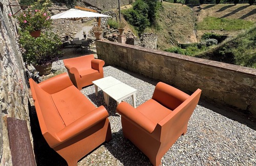 Once the antique mill room in the rustic restored mill house.Our Valentina apartment is on the ground floor, inside the arched doorway. It has 2 single beds that can be joined together seamlessly to make a king-sized double bed, There is a full kitchen, flat screen TV with satellite channels, internet connection full kitchen with dining table for 2 and 2 side chairs for reading. Please read below for the details about the outdoor area. The weekly rate is 750.Euro